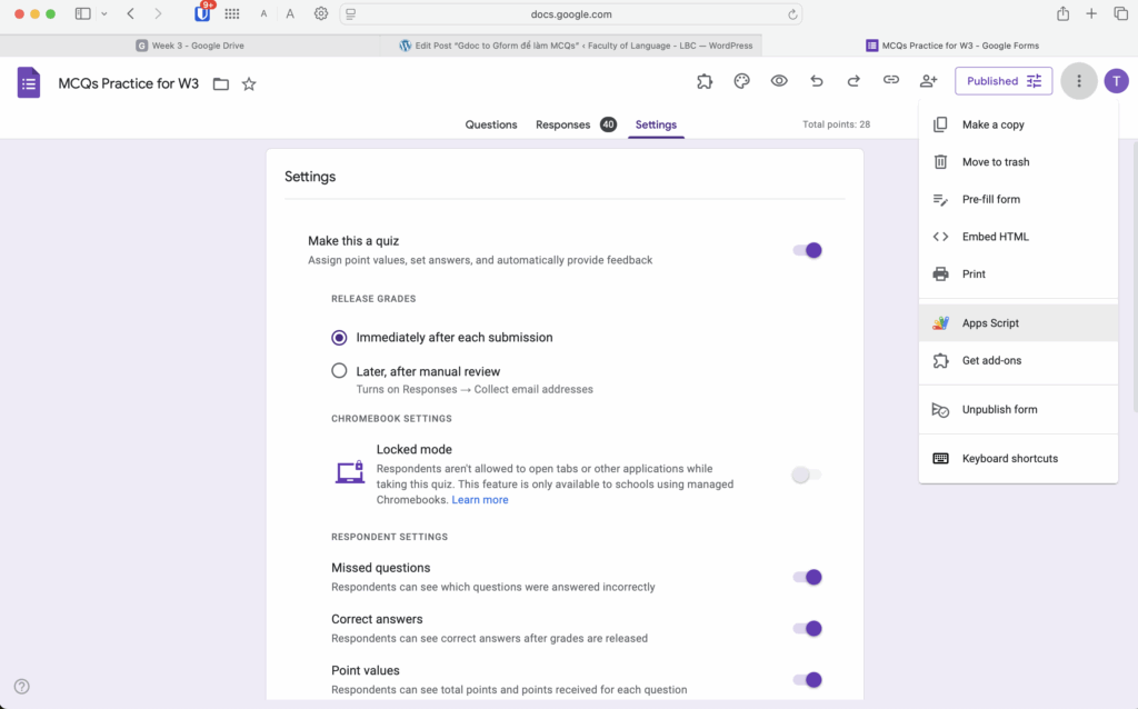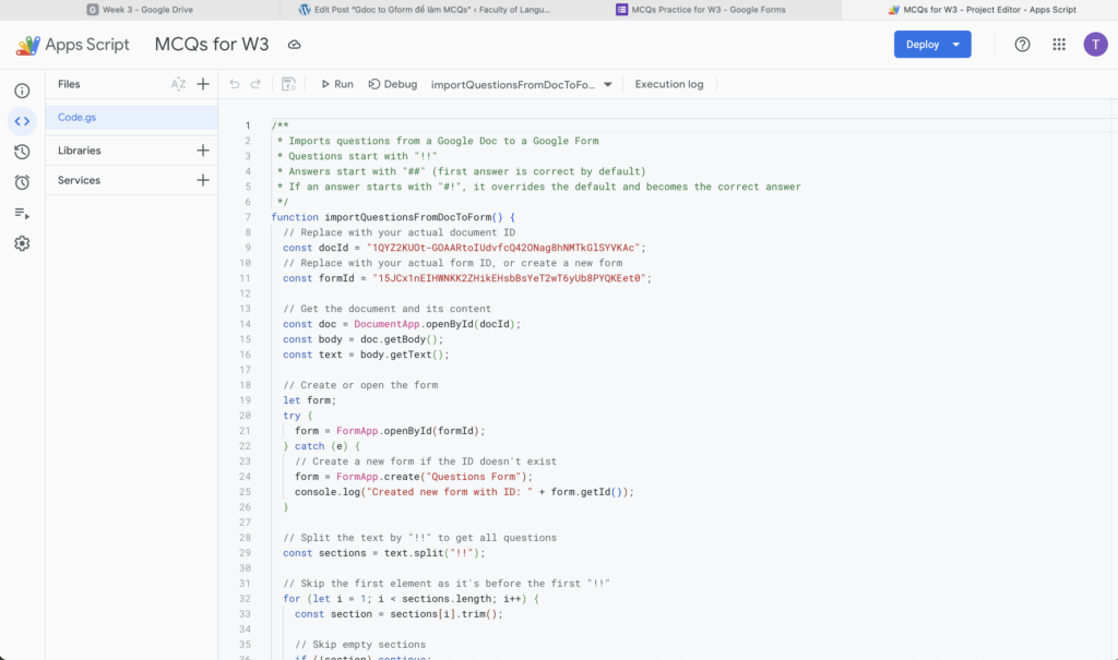 Sau đó, thay docId và formId lấy được từ bước đầu tiên vào trong code (đã bôi đậm vị trí trong code). Sau đó save code và chạy, là form quiz sẽ được tạo ra. Nhớ cấp permission nếu được hỏi.